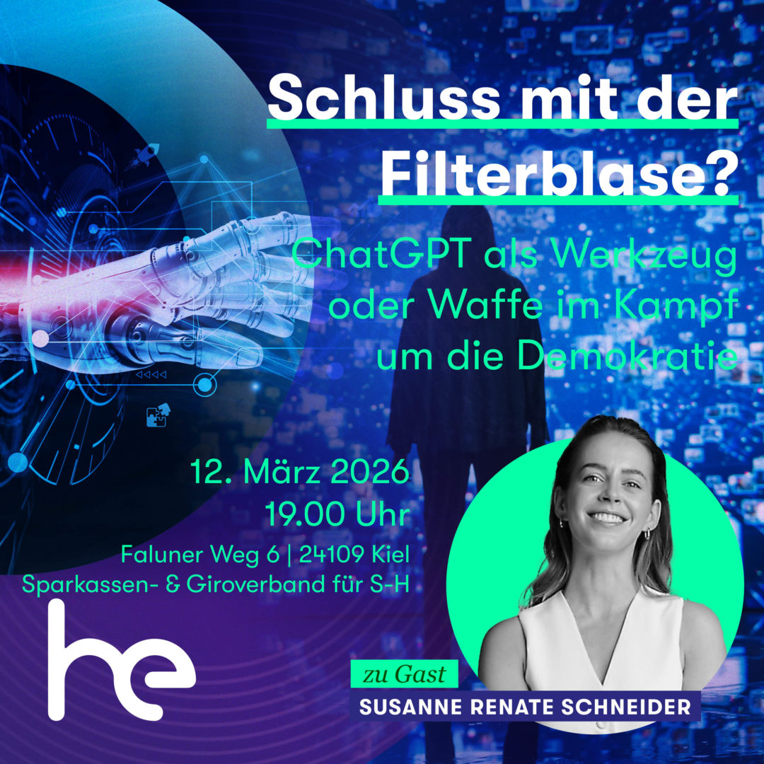 Ergänzend gibt Susanne Renate Schneider persönliche Einblicke in ihren Weg als Gründerin und Female Entrepreneur: Wie sieht unternehmerisches Handeln heute aus? Welche Kompetenzen brauchen wir in einer Gesellschaft, die sich durch Digitalisierung und Demokratieentwicklung rasant verändert? Und wie können Frauen – gerade in Zukunftsfeldern wie KI – sichtbarer, wirksamer und selbstwirksamer agieren?